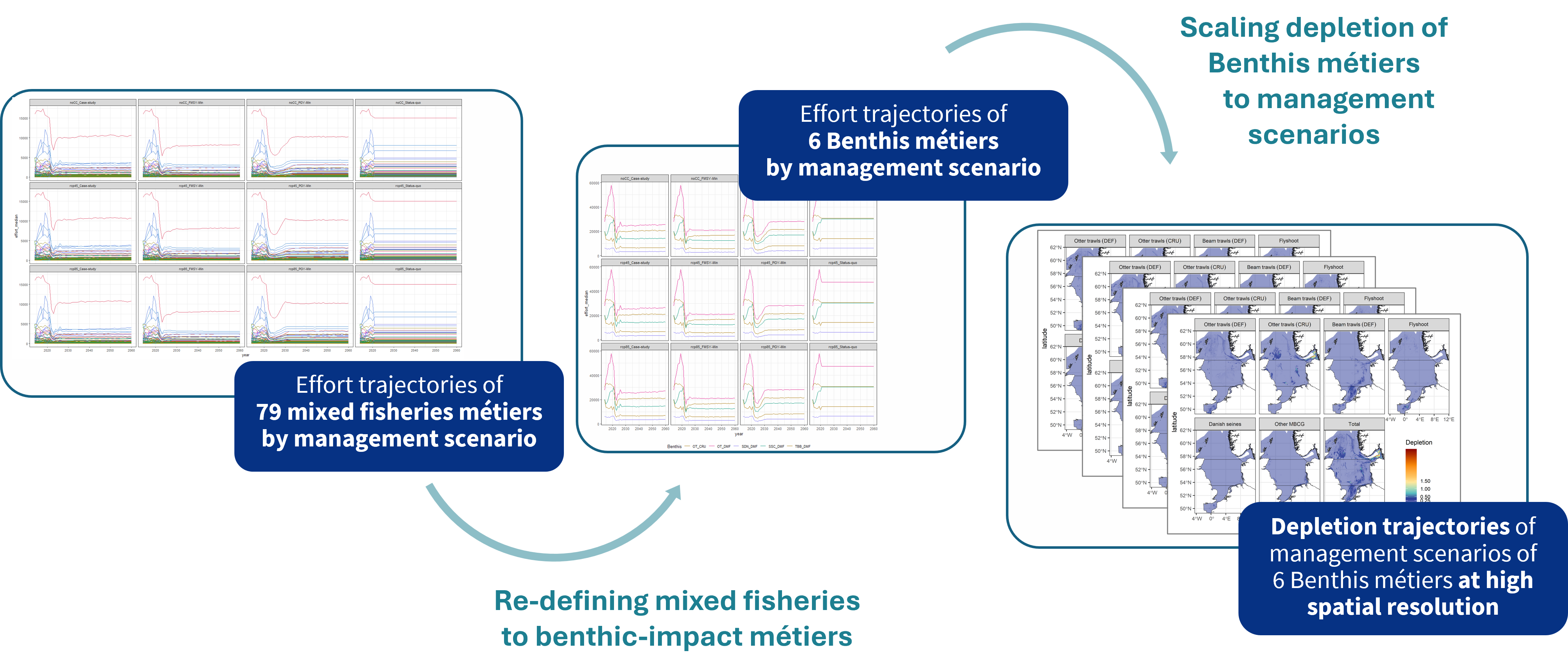 Data on Benthis métiers typically involves fishing frequencies at higher spatial resolution (0.05° by 0.05°) than mixed fisheries métiers, while mixed fisheries métiers comprise data on catch composition of commercial fish stocks at higher and more appropriate resolution of the fishing métiers. To estimate depletion of mixed fisheries scenarios, we first estimate the depletion of Benthis métiers, and then aggregated those Benthis métiers to match the mixed fisheries métiers and enable assessment of their benthic impact risk. Matching Benthis métiers to mixed fisheries métiers allows the estimation of benthic impact risk for a range of mixed fisheries scenarios. Matching datasets of Benthis-métiers with mixed fisheries métiers requires downscaling the analysis to the lowest common denominator, implying a lower resolution categorization of fishing métiers for benthic impact assessment.
